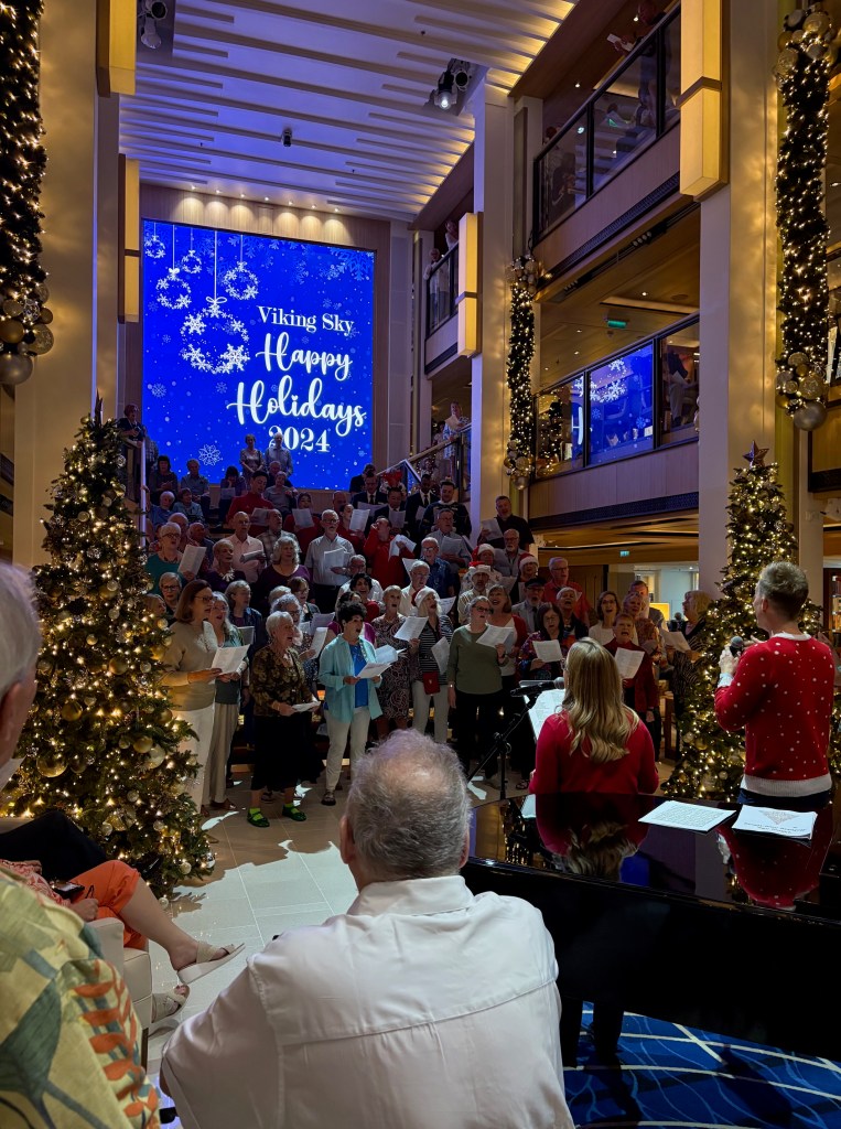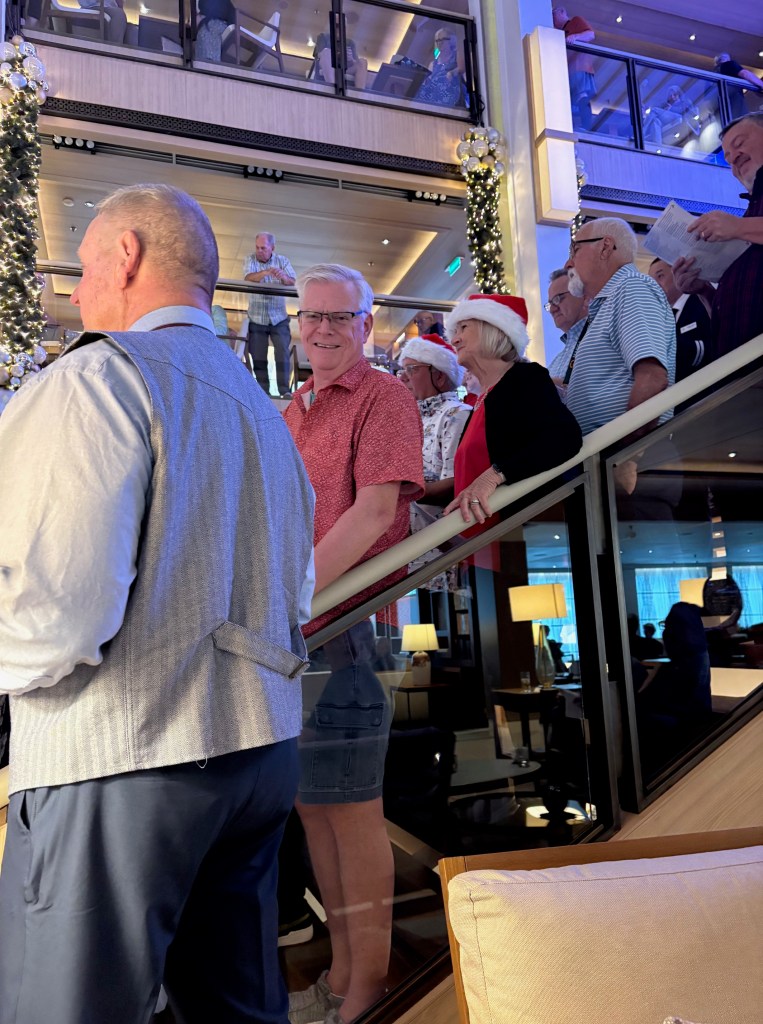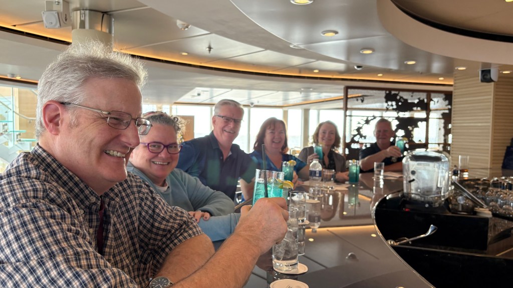 Surprisingly busy on sea days. We have tried bridge lessons, craft classes, trivia, Christmas caroling and working out, plenty to do. Most proud of our inaugural meeting for the A to Z club with some new friends. Our “A” drink was Adios Long Tea (some called it Adios Mother “Trucker”). It was excellent and we had a blast. (Day Two – “B” Day Breakfast martinis, really good)